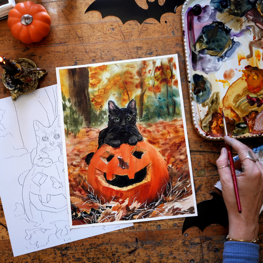 Learn how to paint a cat with this project. We are going to bring this scene to life by working back to front, wet on wet to wet on dry. We will paint our pumpkin by glazing colors on top of each other.